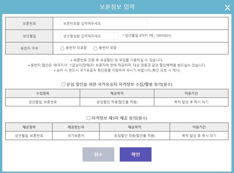 ※ 보훈 할인 대상 : 독립유공자 및 유족, 전·공상군경, 4·19혁명 유공자 및 유족, 공상·순직공무원 및 유족, 5·18민주유공자 및 유족