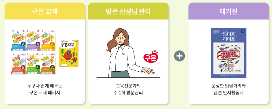 이 프로그램은 구몬 교재를 사용하여 학습하며, 구몬 선생님이 매주 방문하여 학습 관리를 제공합니다.