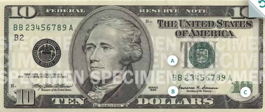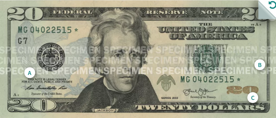 이 중 1달러(조지 워싱턴)와 2달러(토머스 제퍼슨)는 1963년의 도안을 그대로 이용하고 있고 5달러(에이브러햄 링컨)는 2008년 도안, 10달러(알렉산더 해밀턴)은 2006년 도안, 20달러(앤드루 잭슨)는 2003년 도안, 50달러(율리시스 그랜트)는 2004년 도안, 마지막으로 100달러(벤저민 프랭클린)은 가장 최근인 2013년의 도안을 사용하고 있습니다.