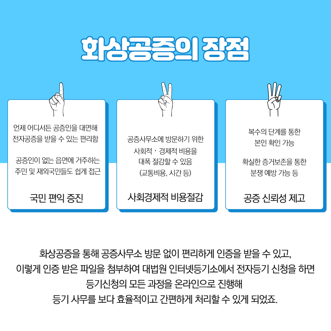 - 편리성: 컴퓨터나 스마트폰을 통해 언제 어디서나 공증인을 대면하여 전자공증을 받을 수 있습니다. 이는 특히 공증 사각지대에 거주하는 주민이나 재외국민에게 큰 도움이 됩니다.