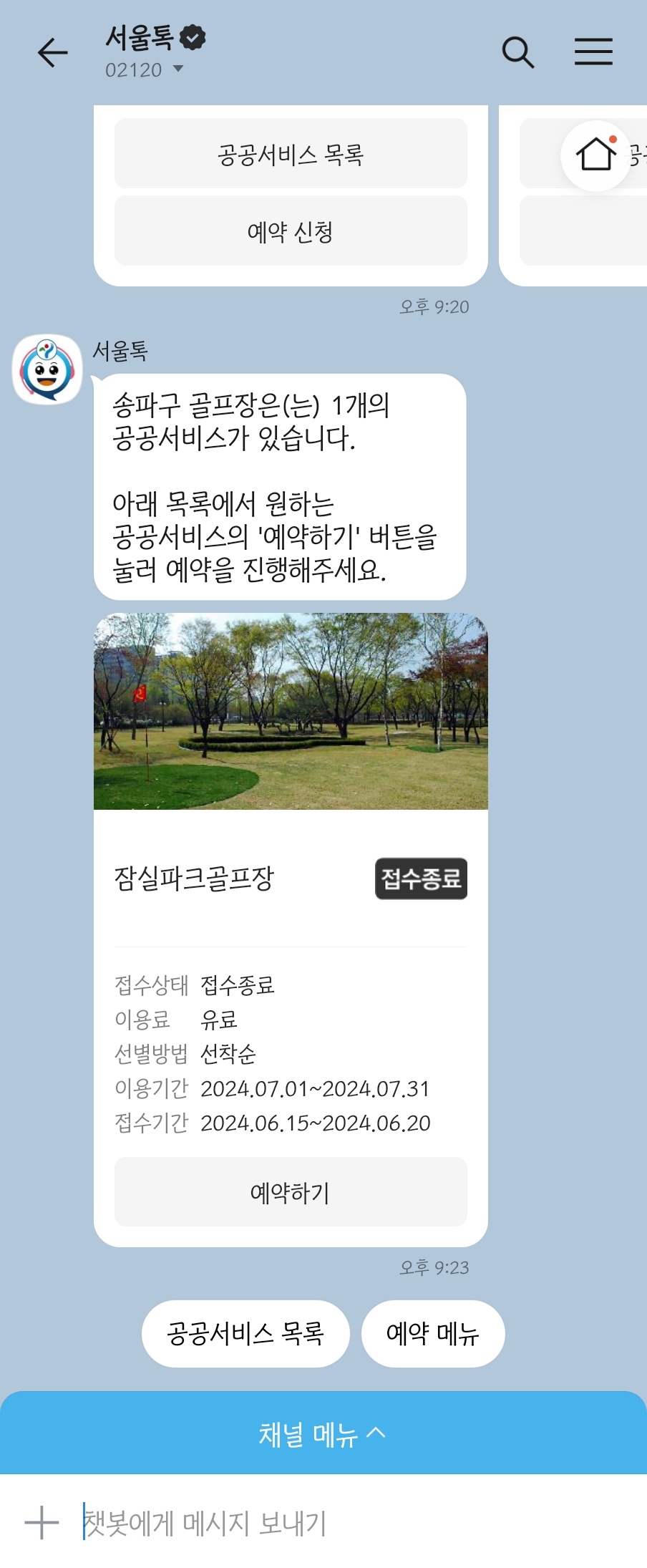 서울시 공공예약서비스는 홈페이지 뿐 아니라 카카오톡채널을 이용해서 손쉽게 이용할 수 있습니다.