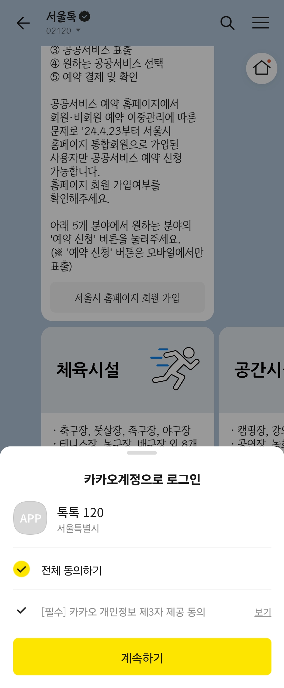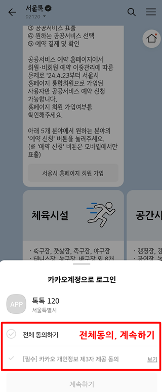 - 첫 등록의 경우 아래와 같이 서울시의 '톡톡120' 가입에 동의하라는 팝업이 뜹니다. 필수 동의이므로 동의하고 넘어갑니다.