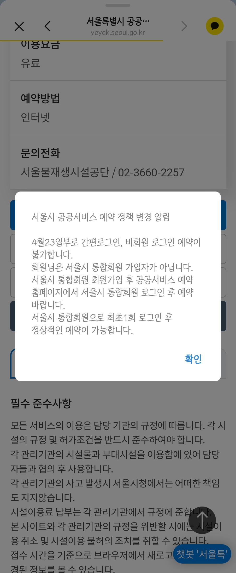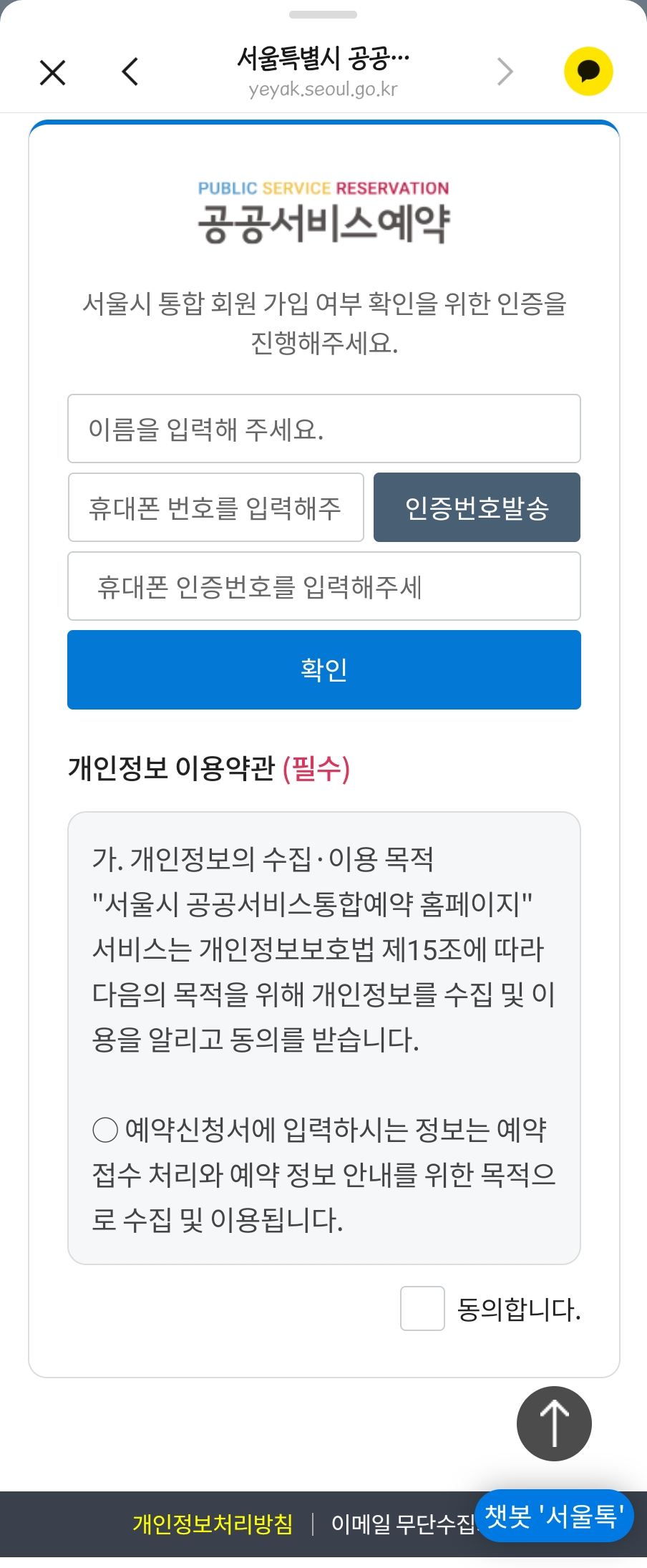 - 예약 가능한 '서남센터 파크골프장'을 클릭 하면 서울시 공공예약 모바일 웹으로 전환되는데, 이 때 공공서비스 회원 가입이 안되어 있는 경우 회원가입이 필요합니다.