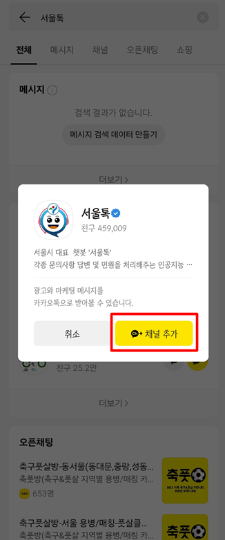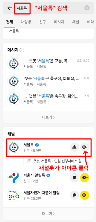 - 검색창에 "서울톡"이라고 입력합니다. 그러면 화면 하단에 "서울톡" 채널이 나오면 오른 쪽의 카카오톡 아이콘을 클릭하여 채널 친구추가 합니다.