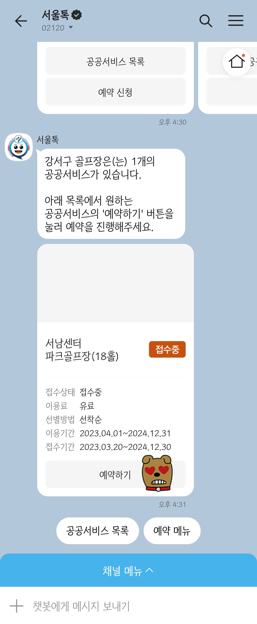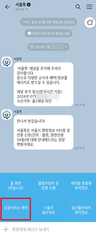 - 채널 추가 시 아래와 서울톡에서 아래와 같은 안내 카톡을 보냅니다. 좌측 하단의 "공공서비스 예약"을 클릭합니다.