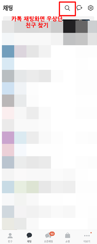 - 먼저, 아래와 같이 카카오톡 채팅 홈에 들어가서 우상단의 돋보기를 클릭합니다.