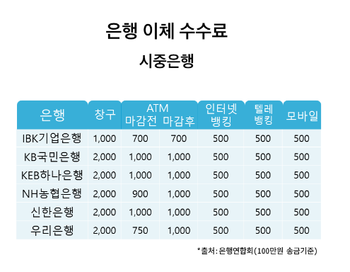창구 송금 수수료 또한 수십년간 유지되어 온 은행의 대표적인 수수료로 송금 금액이 적을 경우에는 1천원 이하이나, 반대로 금액이 큰 경우에는 4천원 까지도 발생합니다.