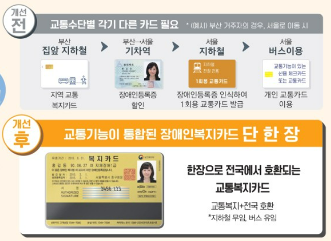 그러나 2023년 4월 1일부터는 지자체와 각 교통수단별 장애인 교통복지(무임승차) 기능을 카드 한장으로 통합하여 전국 단위로 사용할 수 있게되었습니다.