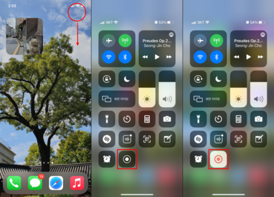- 제어 센터 열고 화면 기록 아이콘 탭(3초 후 녹화 시작)