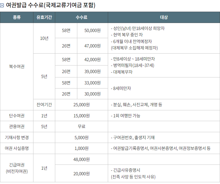 - 수수료: 여권 발급 수수료는 종류와 기간에 따라 다릅니다.