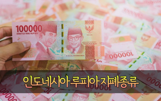 지폐의 종류는 100,000루피아, 50,000루피아, 20,000루피아, 10,000루피아, 5,000루피아, 2,000루피아, 1,000루피아의 7종이 있으며 베트남 동과 함께 높은 화폐 단위로 유명합니다(베트남 최고액권 50만동).