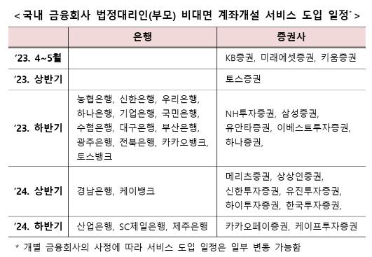 현재 미성년자 자녀의 통장 개설이 '주식계좌'개설을 위한 것이 많으므로 증권 계좌 개설에 관련된 도입이 2023년 상반기 중 먼저 이루어지고, 은행의 경우 하반기에 서비스를 시작할 계획이라고 합니다.