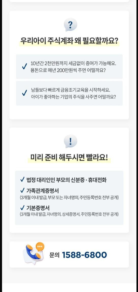 그러나 2023년 4월 금융위원회에서 금융투자협회와 함께 자녀명의 주식계좌 모바일 개설 방안을 내놓았고 이번 달 부터 자녀명의 주식계좌의 비대면 개설이 시작되었습니다.