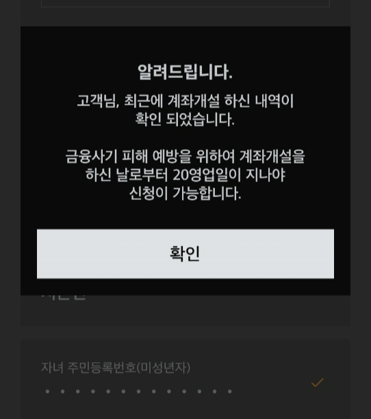 이때 유의하실 것은, 은행 계좌와 마찬가지로 얼마전(최근 20 영업일)에 자녀 계좌(은행, 증권 모두 포함하며 요구불, 증권계좌 해당)를 개설한 적이 있는 경우 증권계좌 신규 개설이 제한된다는 것입니다.