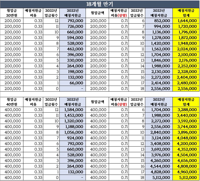 2023년부터 현행 33% 지급되고 있는 매칭지원금(3:1 매칭지원금)이 71%로 상향될 것으로 보이는 바(2023년 입금분부터 인상 확정), 장병내일준비적금(군적금)의 만기시 수령 예상 금액을 예상할 수 있는 조견표를 준비했습니다.