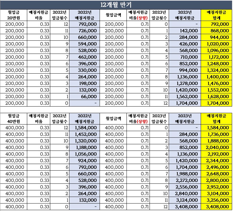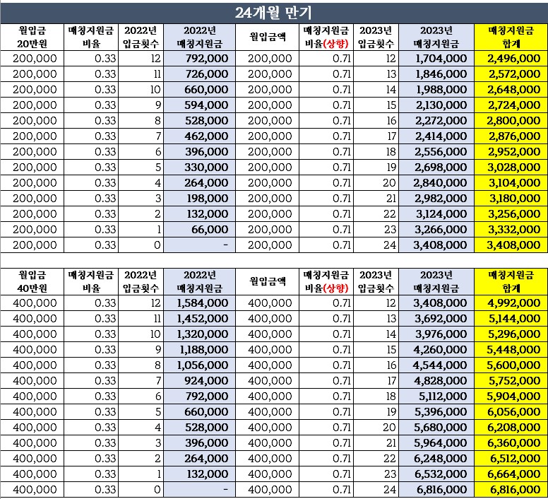 2023년부터 현행 33% 지급되고 있는 매칭지원금(3:1 매칭지원금)이 71%로 상향될 것으로 보이는 바(2023년 입금분부터 인상 확정), 장병내일준비적금(군적금)의 만기시 수령 예상 금액을 예상할 수 있는 조견표를 준비했습니다.
