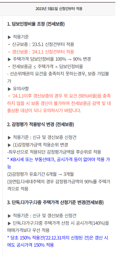 신규 보증의 경우에는 2023년 5월 1일부터 적용하고 갱신 보증의 경우 2023년 12월 31일까지는 현행 기준을 적용하여 보증한도를 [ 주택가격의 100%-선순위 채권 총액 ]으로 적용할 수 있습니다.