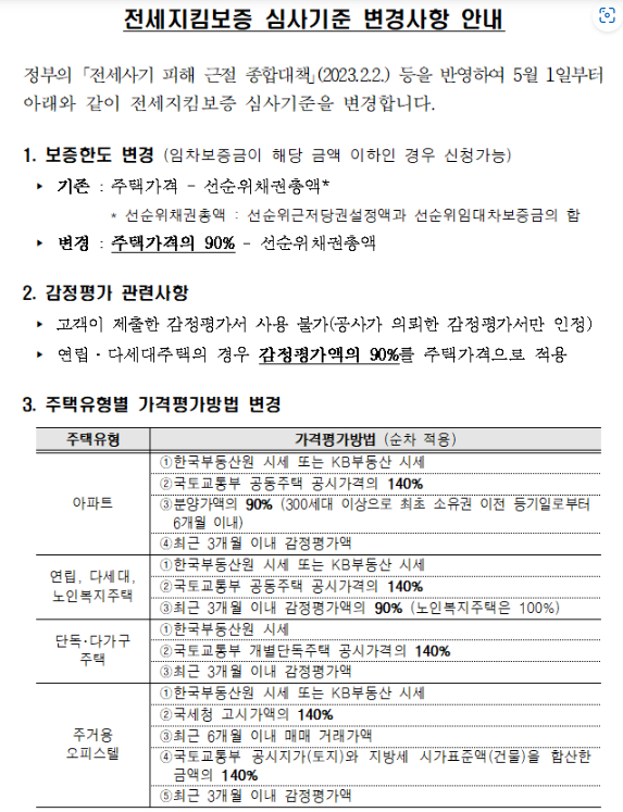HUG는 2023년 2월, HF는 3월에 각각 비슷한 변경 내용을 담은 보증 심사기준 변경을 발표하였습니다.