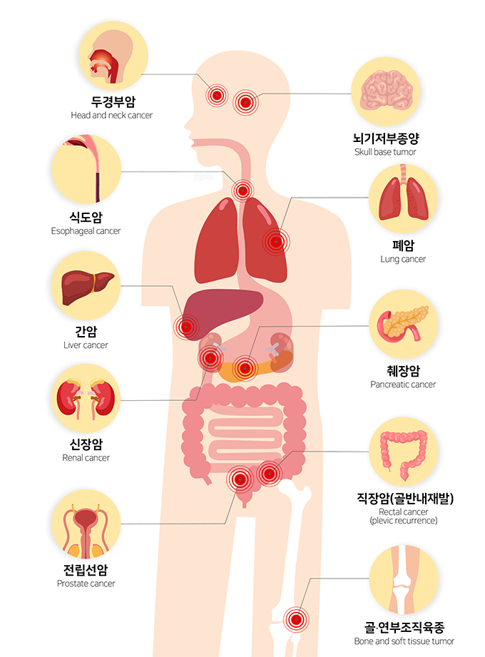 양성자치료에 사용되는 수소입자보다 12배 무거운 탄소입자를 가속시켜 종양만을 조준해 파괴하는 치료기법으로, 기존 방사선치료에 비해 2~3배 높은 치료효과과 짧은 치료 시간을 자랑하여 '꿈의 암치료'라 불리고 있습니다.