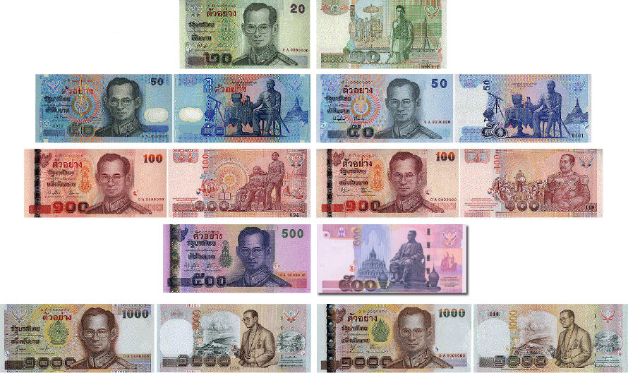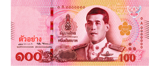 1,000바트, 500바트, 100바트는 2018년, 2017년, 2015년에 각각 새로 발행되었으며, 2018년 발행 지폐에는 라마 10세의 초상이 그려져 있고 2017년과 2015년 발행 지폐에는 라마 9세가 그려져 있으며 뒷면 도안만 다릅니다.