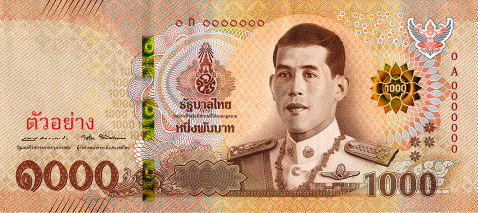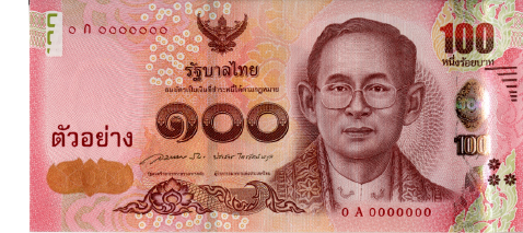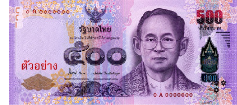 1,000바트, 500바트, 100바트는 2018년, 2017년, 2015년에 각각 새로 발행되었으며, 2018년 발행 지폐에는 라마 10세의 초상이 그려져 있고 2017년과 2015년 발행 지폐에는 라마 9세가 그려져 있으며 뒷면 도안만 다릅니다.