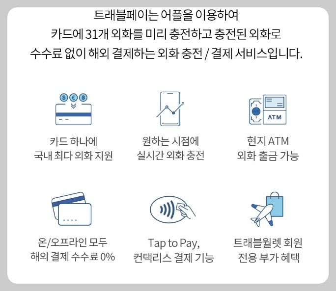 - 해외 현지 결제(38개 통화 선불 충전 가능)