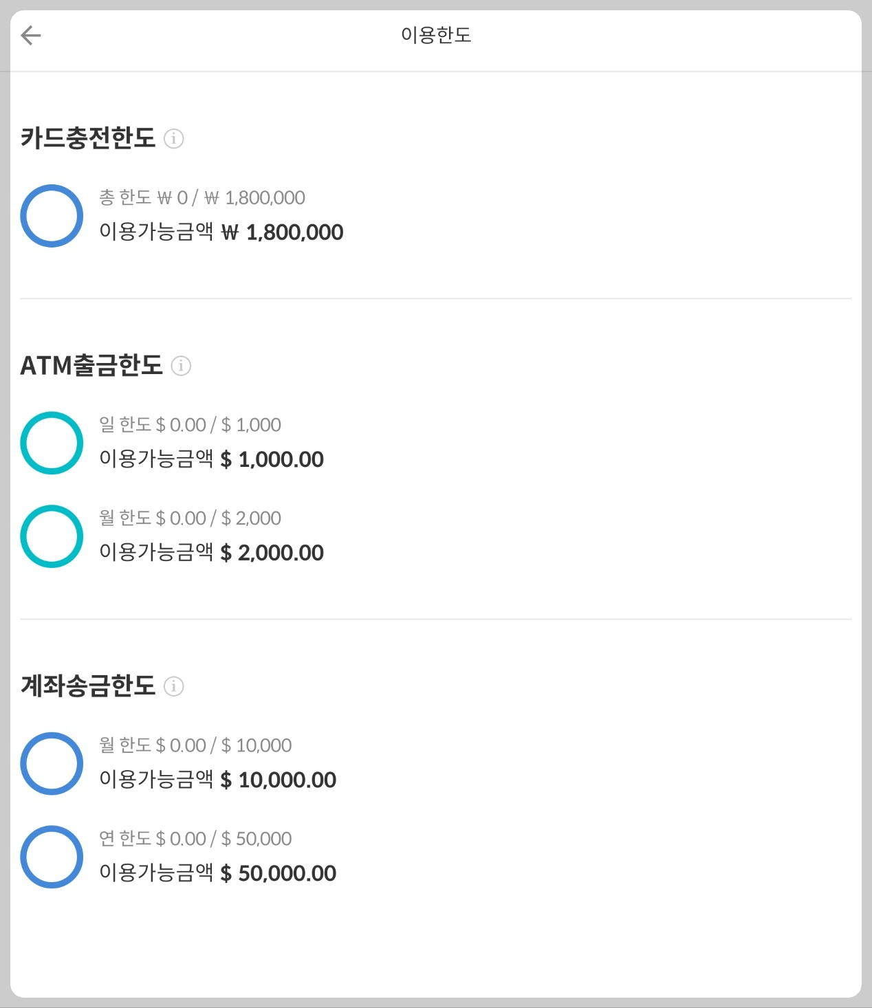 가장 많이 사용하는 해외 이용을 위한 선불 카드 충전은 한도가 180만원이며 모든 통화를 합산한 충전 한도입니다.