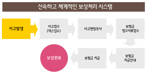 사고 발생 시 팩스로 접수하며 아래의 보상절차에 따릅니다.