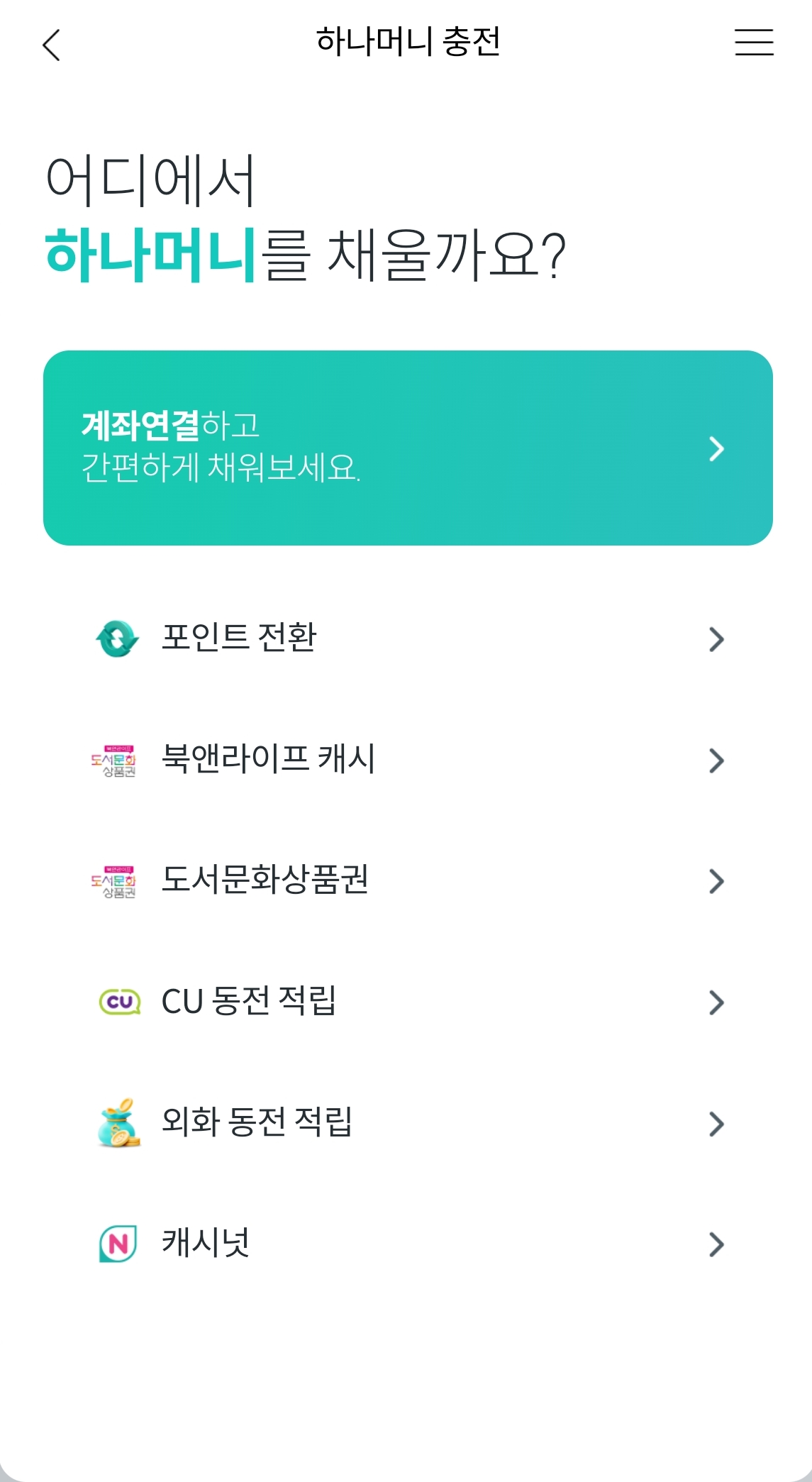 하나머니 연결계좌로 타은행의 계좌를 연결할 수 있지만 하나머니를 입금하는 지정계좌로의 기능만 있고, 하나머니를 충전하려면 하나은행, 하나증권, 하나저축은행의 계좌 연결해야 합니다.