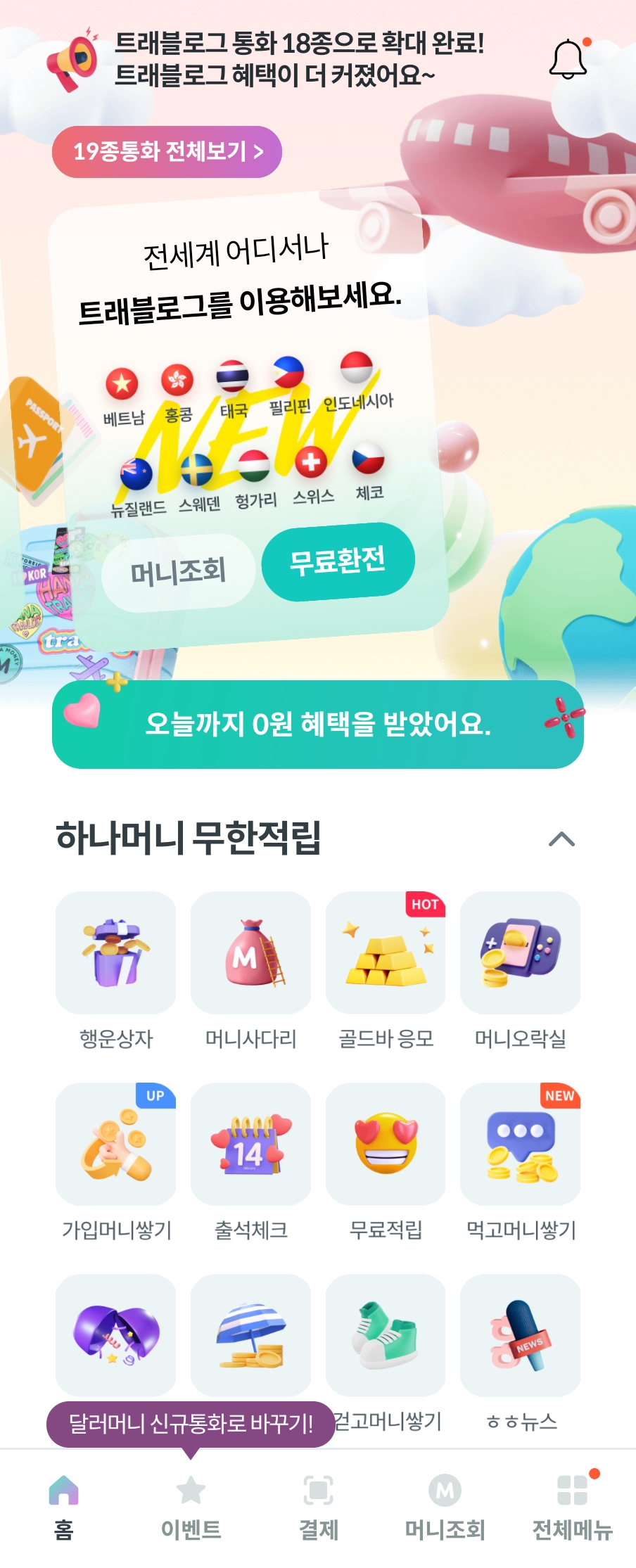 트래블로그 카드의 핵심 기능인 외화 충전은 '하나머니'의 포인트로 이루어지는 것이기 때문에 연결된 결제계좌에서 바로 환전되는 것이 아님 주의, 하나머니 회원 가입 필수
