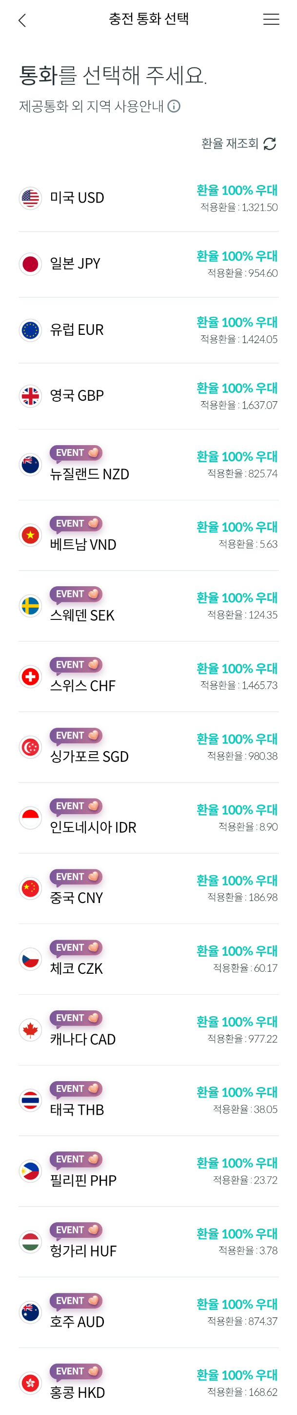 환전가능 통화는 다음과 같습으며, 현재 충전 가능 통화 확대 기념 이벤트로 전 통화 환율우대 100%를 진행하고 있습니다(미국 달러, 일본 엔, 유럽 유로, 영국 파운드는 상시 100% 우대이며, 타 통화는 이벤트성으로 진행 기간이 정해져 있습니다).