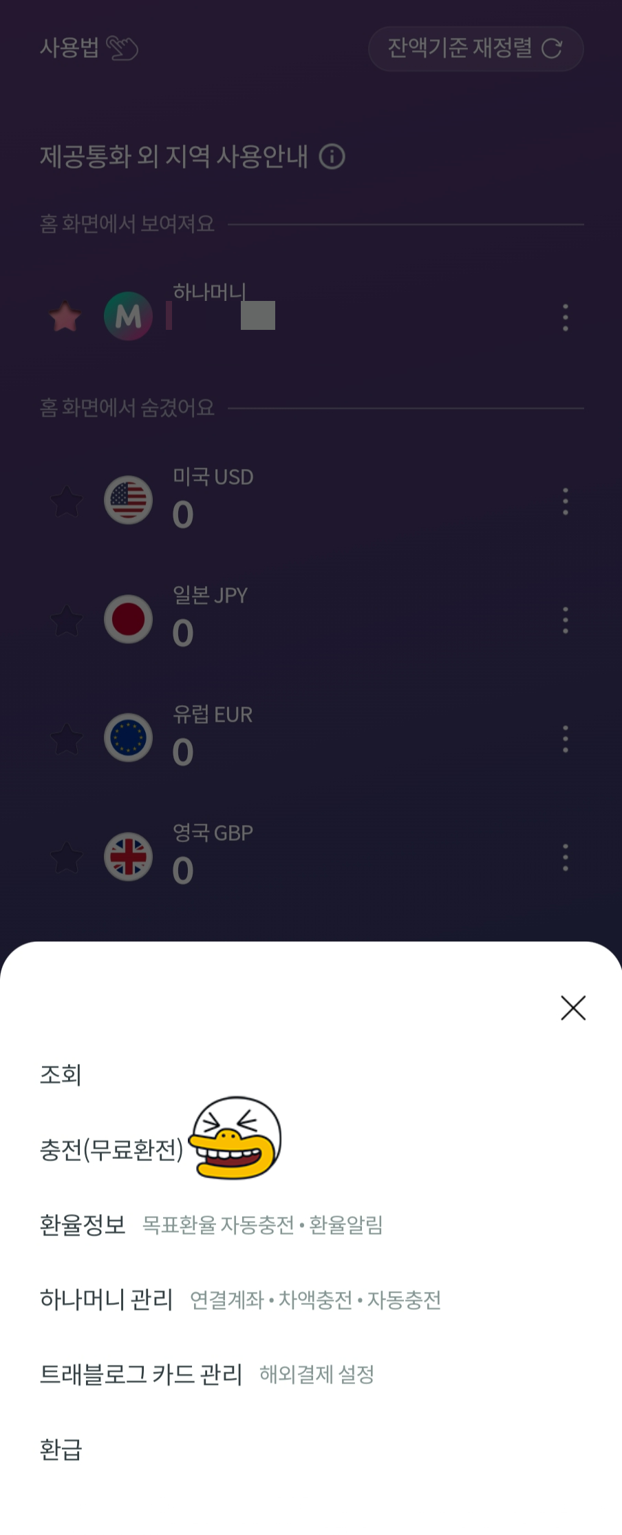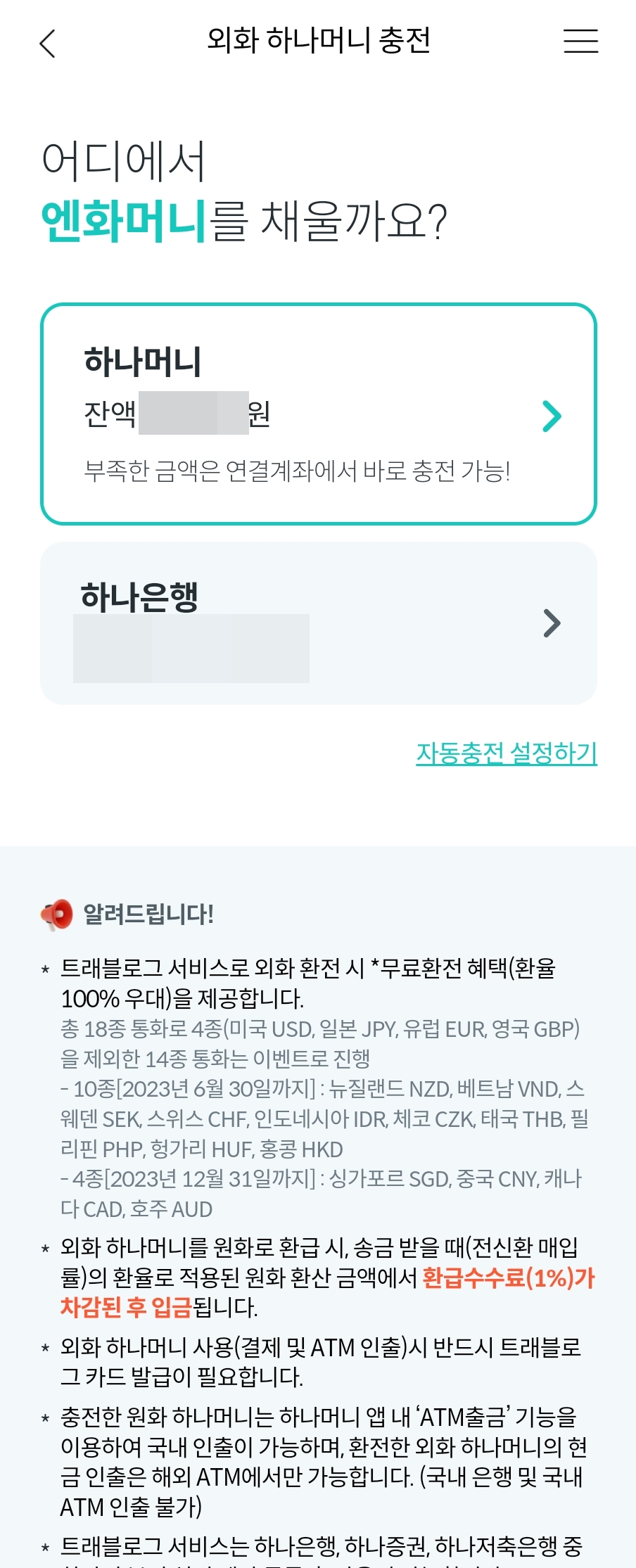 트래블로그 카드의 핵심 기능인 외화 충전은 '하나머니'의 포인트로 이루어지는 것이기 때문에 연결된 결제계좌에서 바로 환전되는 것이 아님 주의, 하나머니 회원 가입 필수