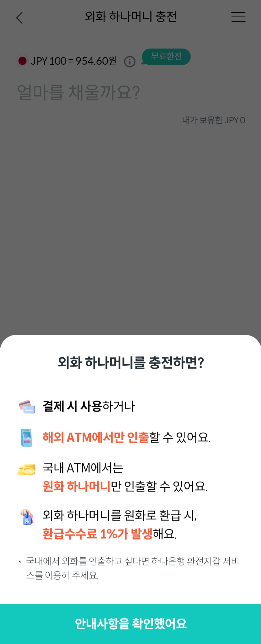 ① 카드를 수령하면 외화 충전을 위해 하나머니를 먼저 충전합니다.
