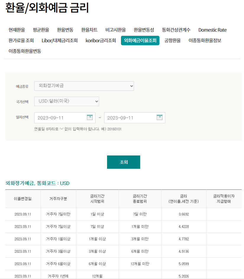 같은 화면에서 외화예금 금리도 조회할 수 있습니다.