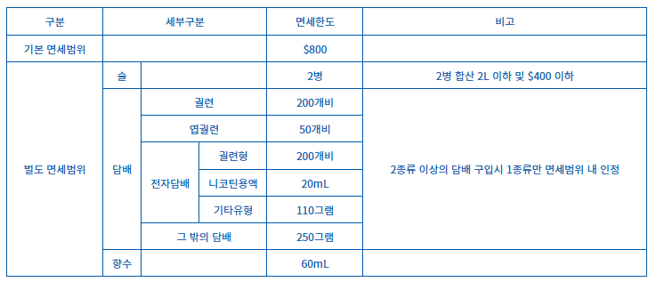 기본 면세범위가 $800이고, [ 술 / 담배 / 향수 ]는 별도의 면세한도가 부여 있습니다.