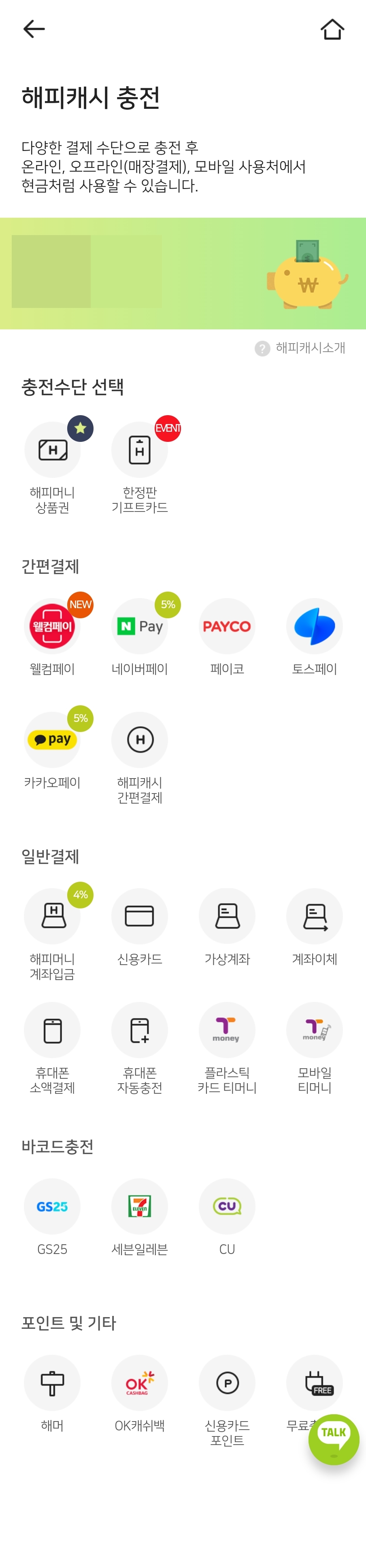 해피캐시는 지류 또는 모바일 상품권 뿐만 아니라 각종 카드 포인트, 계좌 입금, 기프티콘도 해피캐시로 전환하여 해피캐시 사용처에서 사용가능합니다.