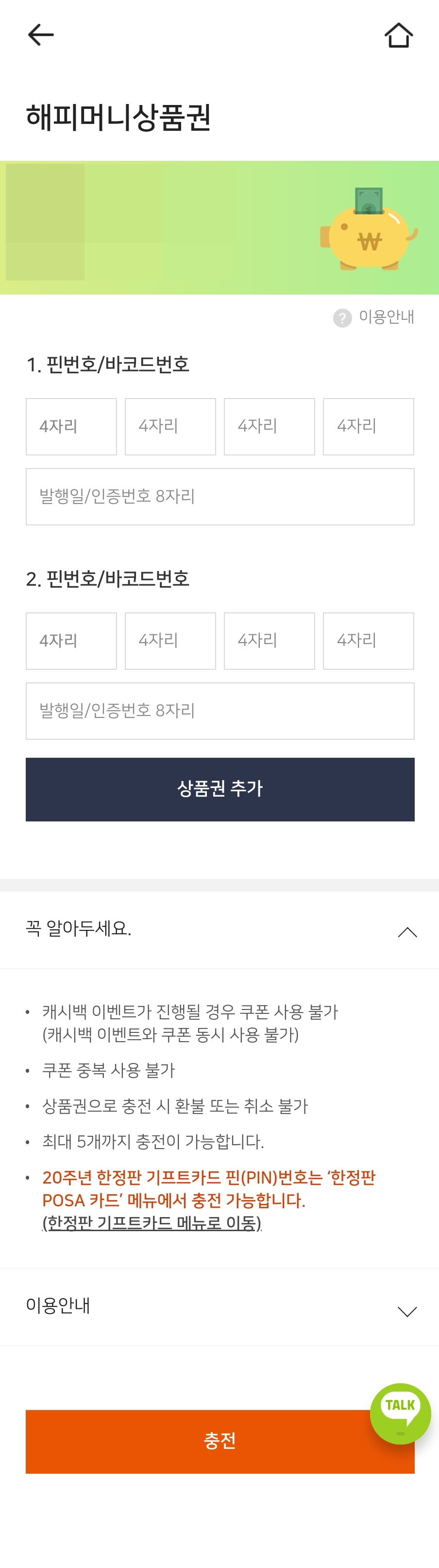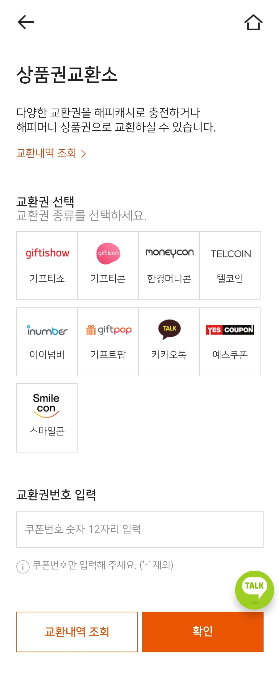 상품권에 있는 고유번호 16자리(지류 상품권의 경우 스크래치를 벗져 나오는 인쇄 번호)를 입력하여 권면액을 해피캐시로 충전할 수 있습니다. 상품권이 여러장 있는 경우 한번에 5장까지 전환할 수 있습니다.