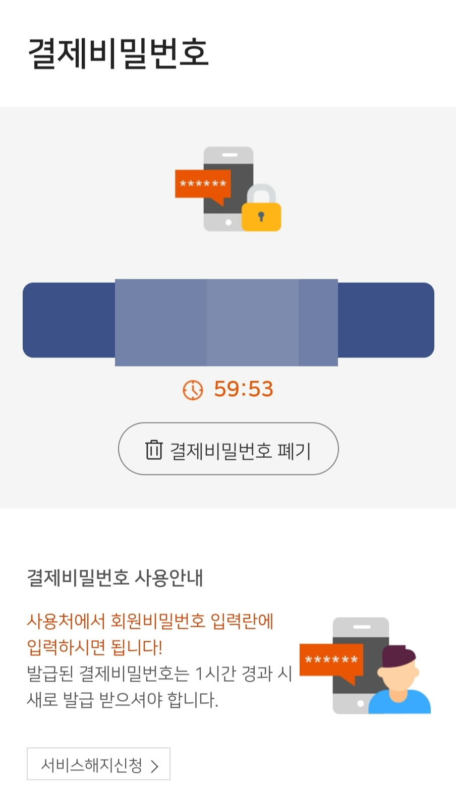 결제비밀번호는 한번 생성시 1시간 유효한 일회성 번호입니다.