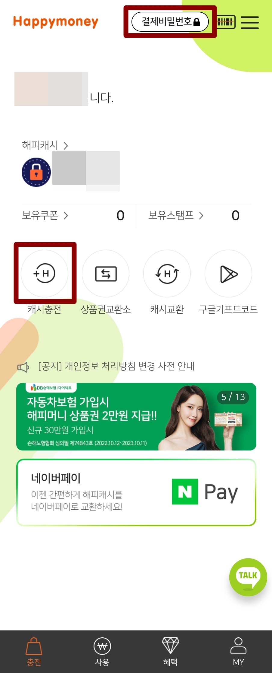 ② 회원가입 후 해피캐시 밑에 있는 '캐시충전'으로 들어감