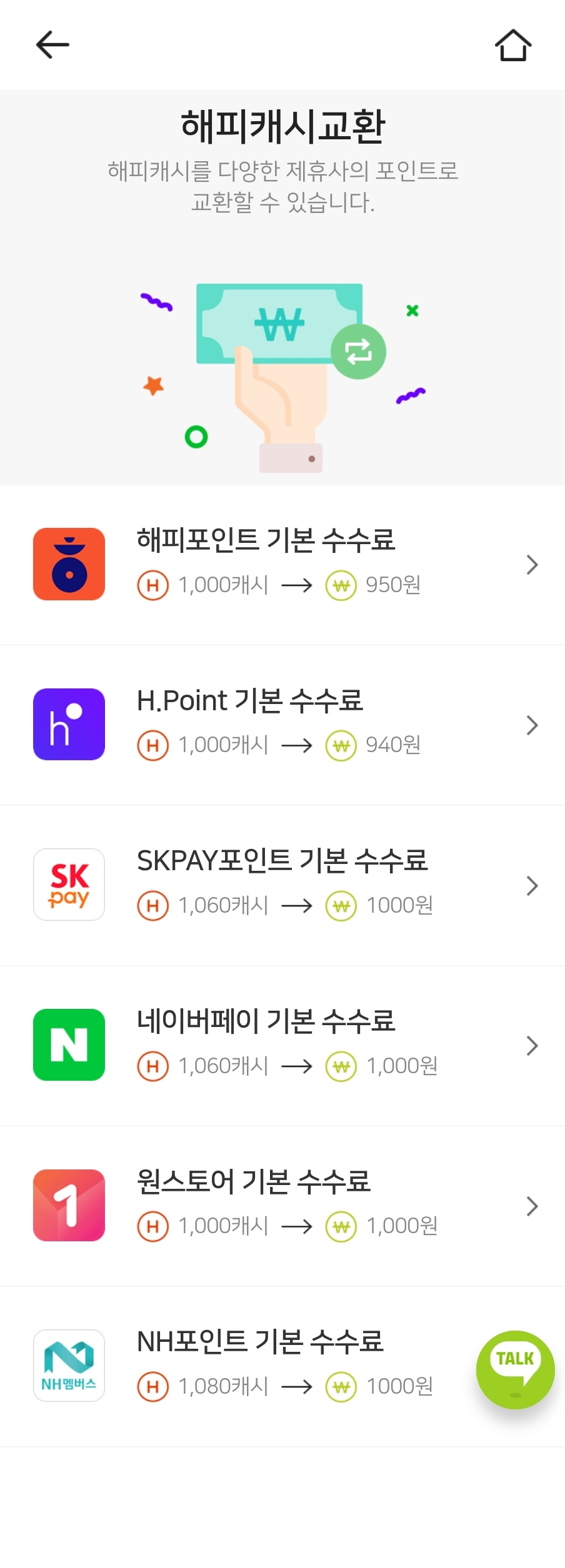 포인트에서 해피캐시 전환 시 각 포인트 별로 전환비율이 정해져 있으며 소정의 수수료가 지출됩니다.
