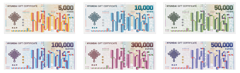 현대백화점상품권은 5천원, 1만원, 5만원, 10만원, 30만원, 50만원의 6종으로 발행됩니다.