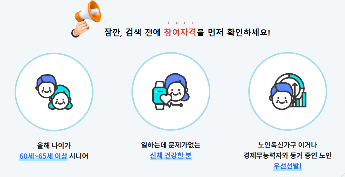 - 오프라인: 주소지 내 행정복지센터, 노인 복지관, 대한노인회, 시니어클럽 등에서 신청