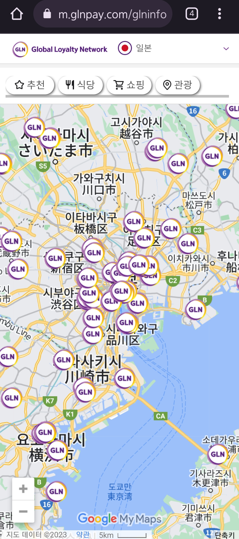GLN으로 결제할 수 있는 가맹점은 GLN 모드로 진입하여 사용 국가를 선택하면 '이용가능매장' 메뉴에서 실시간으로 확인가능한데, 다음과 같이 나옵니다(GLN Pay의 모바일 사이트로 접속하는 방식인데, 해당 사이트로 URL을 찍어 직접 접속 시 연결되지 않으니 유의할 것).