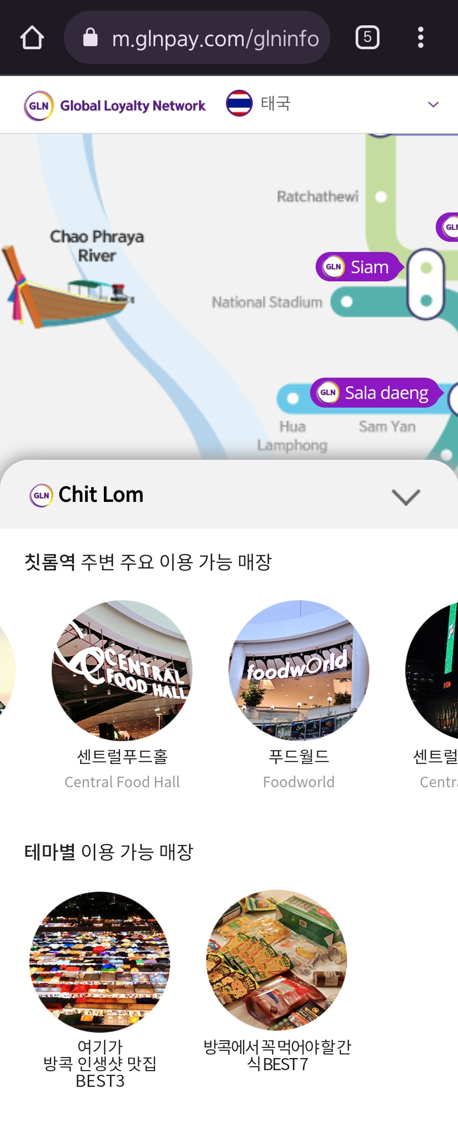 GLN으로 결제할 수 있는 가맹점은 GLN 모드로 진입하여 사용 국가를 선택하면 '이용가능매장' 메뉴에서 실시간으로 확인가능한데, 다음과 같이 나옵니다(GLN Pay의 모바일 사이트로 접속하는 방식인데, 해당 사이트로 URL을 찍어 직접 접속 시 연결되지 않으니 유의할 것).