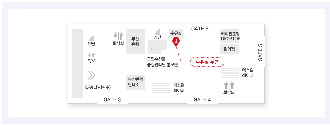 | 국제 여객터미널 2층 수유실 부근 | (월~금요일) 10:30 ~19:30 (토~일요일) 06:30 ~ 19:30 |