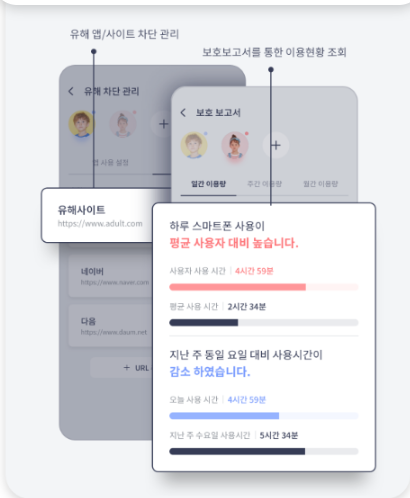 유해사이트나 유해앱을 자동 차단해주고, 상세한 보호보고서를 보호자에게 제공합니다.
