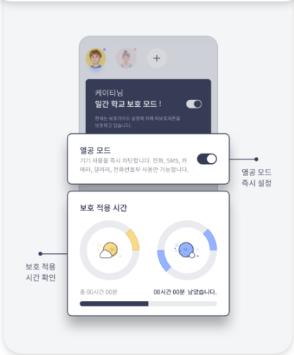 이용시간, 사용가능 앱을 지정하여 올바른 스마트폰 사용 습관을 기를 수 있습니다(열공모드, 안부모드).