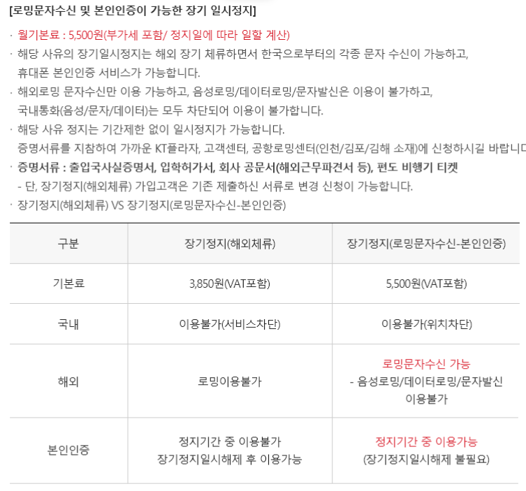KT 해외사용 일시정지 및 문자만 수신 서비스 신청방법 및 요금 정리