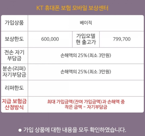 - 보상 한도는 가입한 휴대폰의 출고가와 보험 상품별 최대 가입 금액 중 낮은 금액으로 설정됩니다.