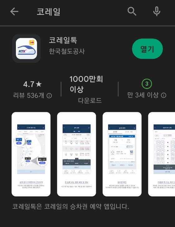 플레이스토어(앱스토어)에서 '코레일'을 검색합니다.